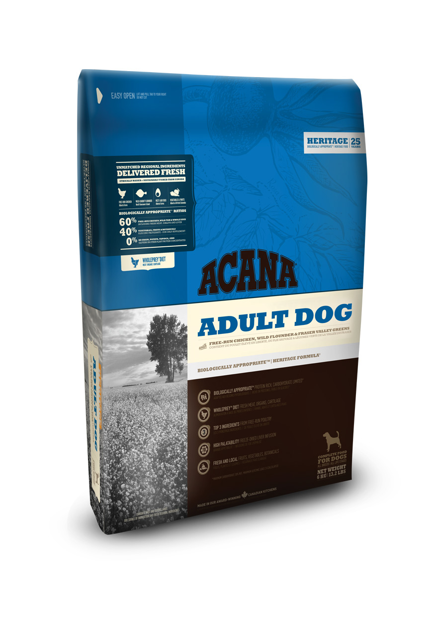 KUHANA V NAŠIH NAGRAJENIH KUHINJAH V KANADI, JE ACANA ADULT DOG POLNA SVEŽIH REGIONALNIH SESTAVIN, PIŠČANČJEGA MESA IN JAJC NESNIC PROSTE REJE, DIVJE IVERKE IN NA SONCU DOZORELEGA SADJA IN ZELENJAVE VSE DOSTAVLJENO IZ NAŠIH REGIJ, SVEŽE IN POLNO DOBREGA OKUSA, DA BI DOSEGLI VRHUNSKO KONDICIJO PRI VSEH PSIH. PREBERITE SEZNAM NAŠIH SESTAVIN IN PREPRIČANI SMO, DA SE BOSTE STRINJALI.
