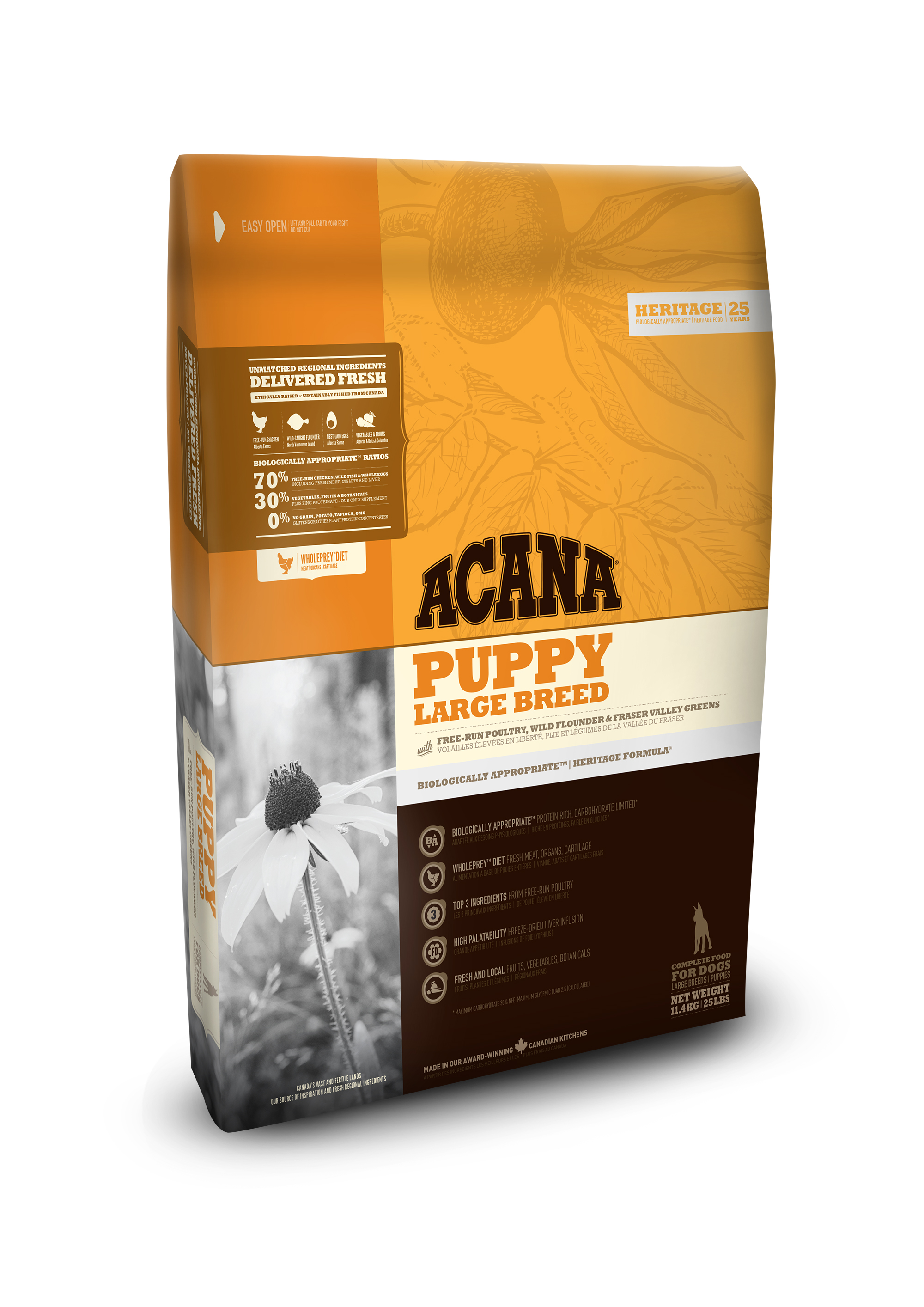 KUHANA V NAŠIH NAGRAJENIH KUHINJAH V KANADI, JE ACANA PUPPY LARGE BREED POLNA PIŠČANČJEGA MESA IN JAJC NESNIC PROSTE REJE, DIVJE IVERKE IN NA SONCU DOZORELEGA SADJA IN ZELENJAVE. VSE DOSTAVLJENO SVEŽE IZ NAŠIH REGIJ, POLNO DOBREGA OKUSA, DA BI BIL VAŠ MLADIČ SREČEN, ZDRAV IN MOČAN. PREBERITE SEZNAM NAŠIH SESTAVIN IN PREPRIČANI SMO, DA SE BOSTE STRINJALI.