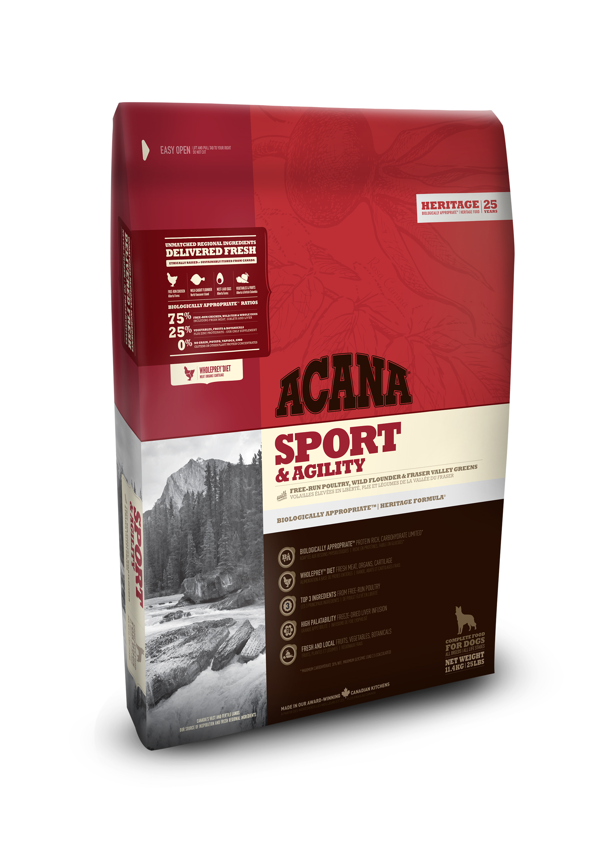 KUHANA V NAŠIH NAGRAJENIH KUHINJAH V KANADI, JE ACANA SPORT & AGILITY POLNA SVEŽIH REGIONALNIH SESTAVIN, VKLJUČNO S PIŠČANČJIM MESOM IN JAJCI NESNIC PROSTE REJE, DIVJO IVERKO IN NA SONCU DOZORELIM SADJEM IN ZELENJAVO. VSE DOSTAVLJENO IZ NAŠIH REGIJ, SVEŽE IN POLNO DOBREGA OKUSA, DA BI DOSEGLI VRHUNSKO KONDICIJO PRI VSEH AKTIVNIH PSIH. PREBERITE SEZNAM NAŠIH SESTAVIN IN PREPRIČANI SMO, DA SE BOSTE STRINJALI.