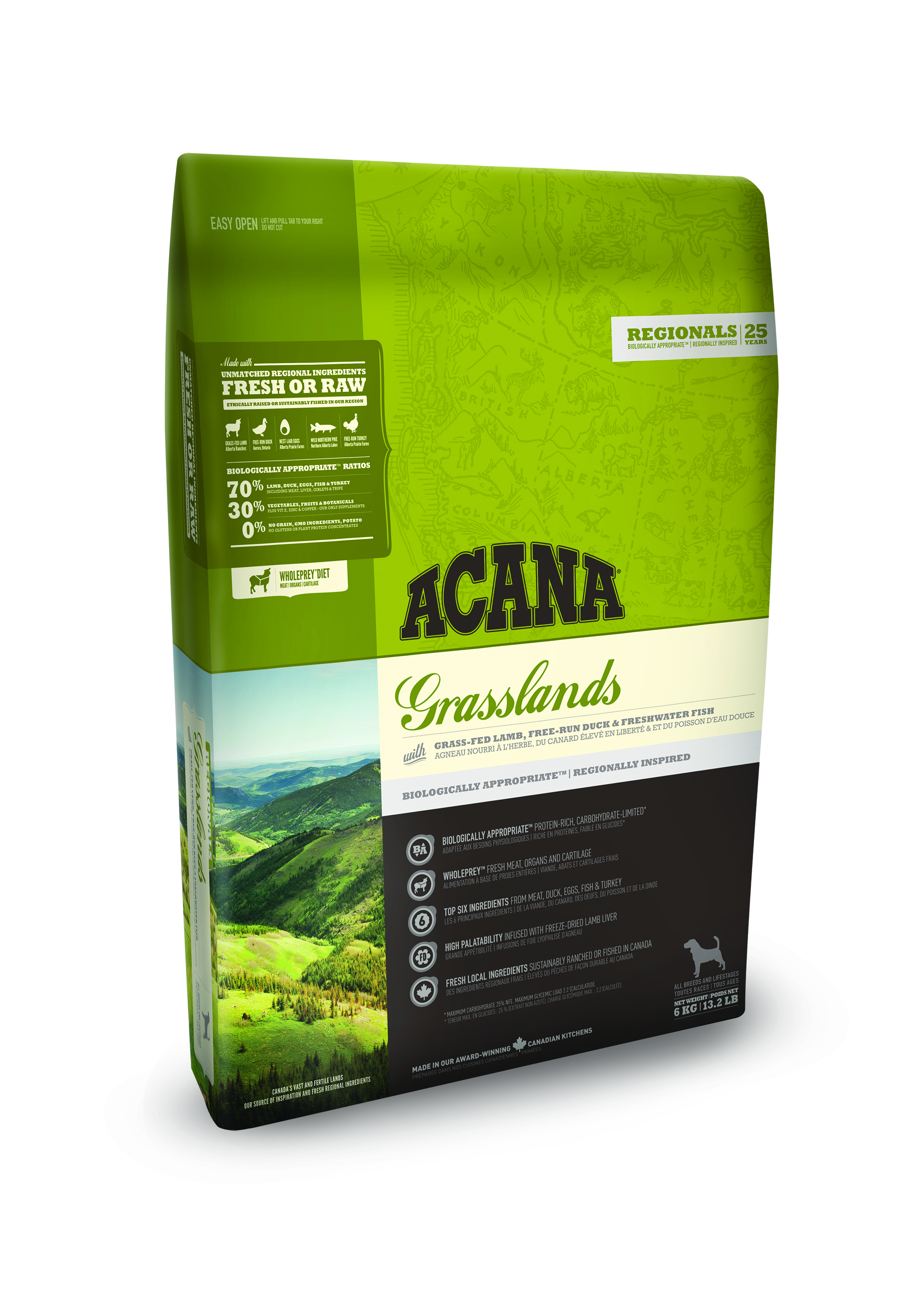 ACANA GRASSLANDS JE POLNA SVEŽE IN SVEŽE ZAMRZNJENE JAGNJETINE, RAC IN JAJC IZ PROSTE REJE TER SLADKOVODNIH RIB, V WHOLEPREY MERILIH, KI PREDSTAVLJA NARAVNO PREHRANO. Z OMEJENO KOLIČINO OGLJIKOVIH HIDRATOV IN OBILICO MESNIH BELJAKOVIN SE DOSEGA VRHUNSKO TELESNO KONDICIJO.