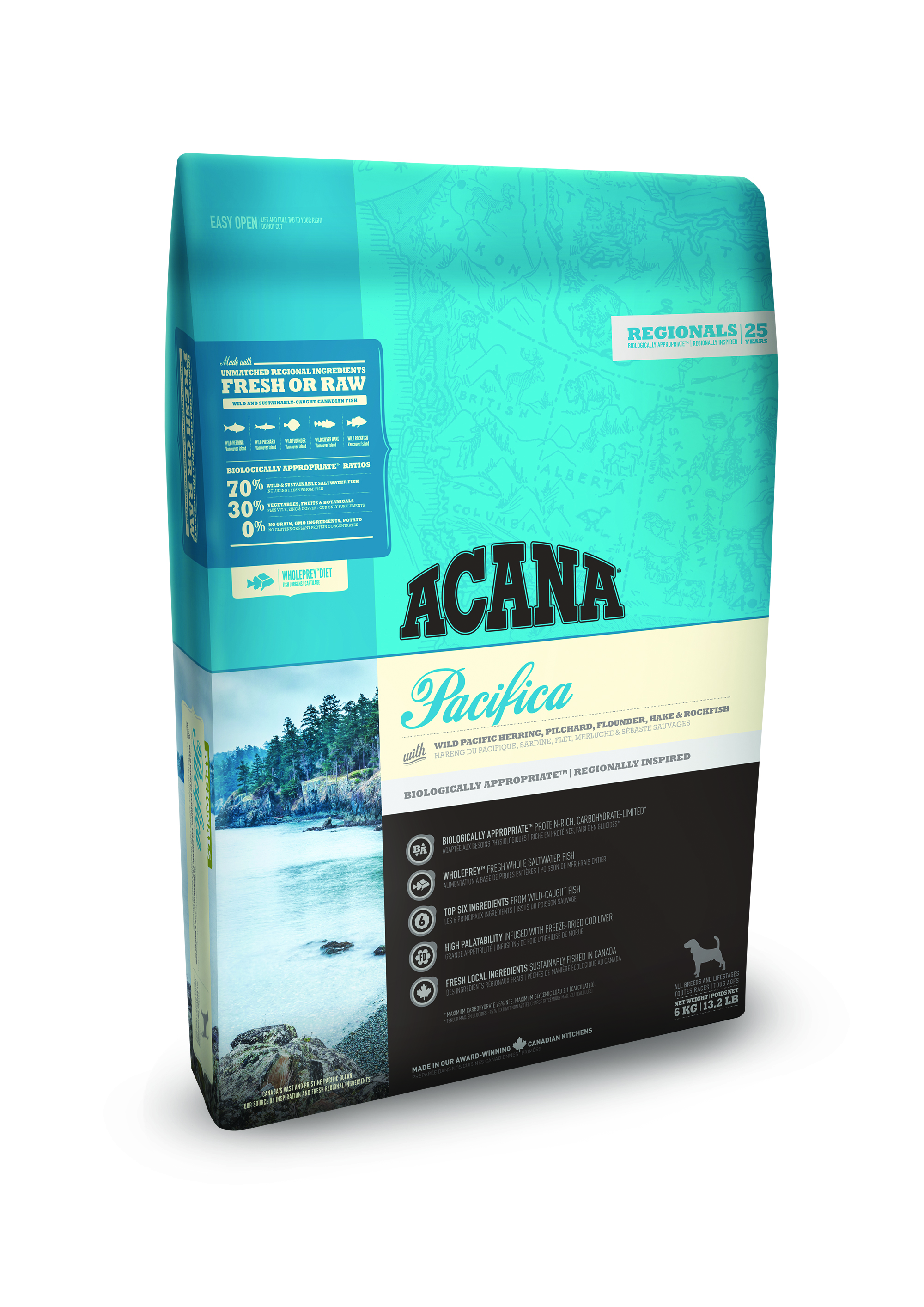 ACANA PACIFICA JE POLNA SVEŽEGA IN SVEŽE ZAMRZNJENEGA MESA DIVJEGA SLEDA, SARDELE, IVERKE, OSLIČA IN RDEČEGA OKUNA, ULOVLJENIH OB OBALI SEVERNEGA VANCOUVRA.