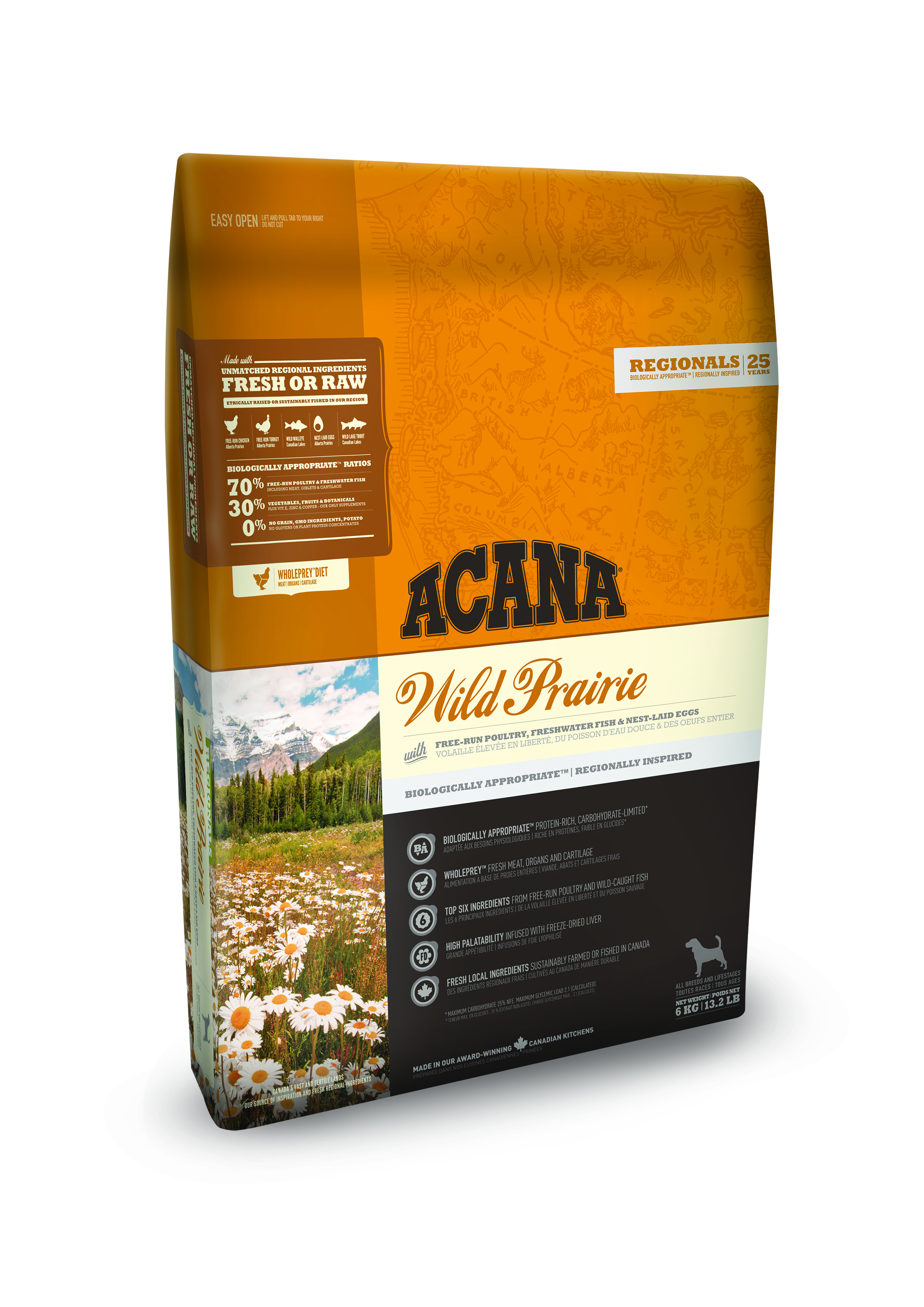 ACANA WILD PRAIRIE JE POLNA SVEŽEGA IN SVEŽE ZAMRZNJENEGA PIŠČANČJEGA MESA, PURANJEGA MESA IN CELIH JAJC IZ PROSTE REJE, TER SVEŽIH RIB IZ TRAJNOSTNIH VIROV, KI PREDSTAVLJA WHOLEPREY™ OBROK KOT NARAVNO PREHRANO BREZ DODATKOV. Z OMEJENO KOLIČINO OGLJIKOVIH HIDRATOV IN OBILICO MESNIH BELJAKOVIN SE DOSEGA VRHUNSKO TELESNO KONDICIJO.