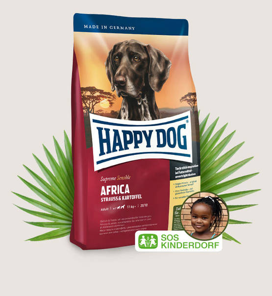 Ta posebno okusna hrana Super-Premium kakovosti se izvrstno obnese pri vseh izbirčnih pasjih gurmanih, ki iščejo nekaj posebnega. Primerna je tudi za zelo občutljive pse srednjih in velikih pasem, ki imajo posebne prehranske potrebe: Happy Dog Africa združi nojevo meso in krompir v edinstveno recepturo. Nojevo meso je zelo redek beljakovinski vir in s tem idealen za pse z intolerancami na hrano. Krompir ne vsebuje glutena in se priporoča pri psih, ki so intolerantni na žitarice. Dragocene Omega-3 in Omega-6 maščobne kisline – pomembne za zdravo kožo in svetlečo dlako – zaokrožijo to ekskluzivno recepturo. Briketi so izvrstno prilagojeni ugizu psov srednjih in velikih pasem. Proizvedeno v Nemčiji pod strogim nadzorom kakovosti!!