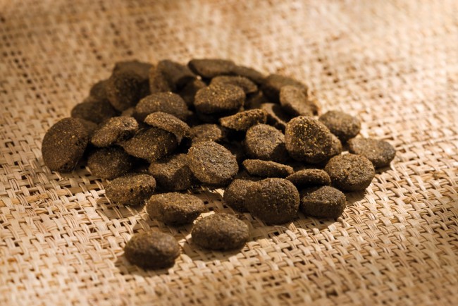 Sestavine: Ječmen, losos (12%), kunčje beljakovine* (9%), polnozrnata ovsena moka, krompirjevi kosmiči*, perutninska maščoba, hidrolizat jeter, dikalcijev fosfat, pesni rezanci (melasa) (razsladkana)*, jabolčne tropine* (0,8%), posušena cela jajca, natrijev klorid, kvas*, kalijev klorid, morske alge* (0,15%), laneno seme (0,15%), školjčno meso* (0,05%), juka (Yucca schidigera)* (0,02%), mlečni osat, artičoke, regrat, ingver, brezovo listje, kamilica, koriander, rožmarin, žajbelj, golostebelni sladki koren, timijan, kvas (ekstrahiran)*, (Posušena zelišča skupaj: 0,14%). (* sušeno) Prebavljiva energija: 1605 KJ/100g; 3840 Kcal/kg
