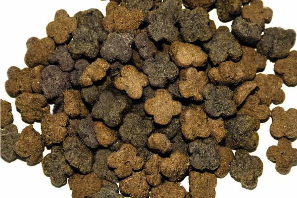 Sestavine: Perutninske beljakovine (24,5%)*, pešnična moka, pšenica, koruza, perutninska maščoba (5%), ribja moka (2,5%), jagnječje beljakovine (2,5%)**, krompirjeve beljakovine**, pesni rezanci (melasa) (razsladkana), hemoglobin**, sončnično olje, jabolčne tropine**, natrijev klorid. (*sušeno, delno hidrolizirano; **sušeno) Prebavljiva energija: 1610 KJ/100g; 3850 Kcal/kg