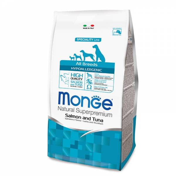 Monge Natural Superpremium posebna linija Hypoallergenic z lososom in tuno je popolna in uravnotežena hrana za vse pasme odraslih psov, ki zahtevajo visoko prebavljivo hrano.