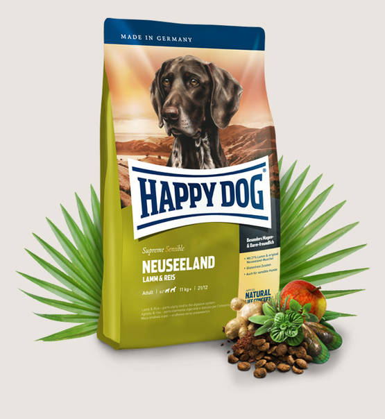 Izredno okusna in visoko prebavljiva popolna hrana Happy Dog Neuseeland, Super-Premium kakovosti, vsebuje 21% jagnjetine in je obogatena z dragocenim školjčnim mesom zelenouste novozelandske školjke.