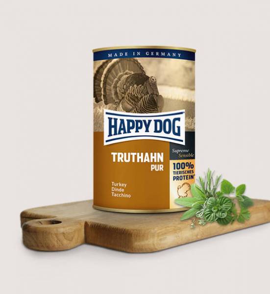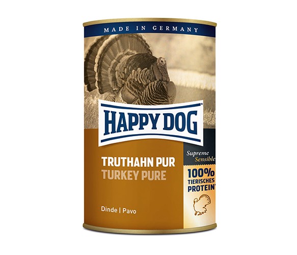 Mokra hrana Happy Dog Puran čisto meso je narejena izključno iz svežega puranjega mesa in proizvedena v Nemčiji.