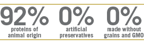 ANALITIČNE SESTAVINE: Surove beljakovine 33.00%; surove maščobe in olja 21.50%; surova vlaknina 1.90%; vlaga (max) 9.00%; surovi pepel 7.90%; kalcij 1.10%; fosfor 0.90%; magnezij 0.09%; omega-6 maščobne kisline 3.30%; omega-3 maščobne kisline 0.60%; DHA 0.30%; EPA 0.15%; glukozamin 1200mg/kg; hondroitin 900mg/kg.