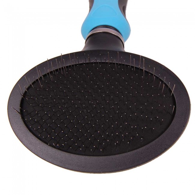 Ovalna, upogljiva GogiPet Slicker Brush krtača za pse velikosti ca. 18,8 cm x 9,5 cm x 3,2cm je posebej oblikovana tako, da z njo uspešno odstranimo umazanijo in odpadajočo dlako, nežno razčešemo sprijeto in zvozlano dlako ter prezračimo kožuh psa do kože. Po uporabi GogiPet Premium Slicker Brush krtače S bo kožuh psa svežega in sijočega videza. Krtača je srednje trda, a njena upogljiva površina in iglice nameščene v mehko prožno podlogo zagotavljajo nežno, varno a učinkovito uporabo. Ročaj krtače je ergonomsko oblikovan in izdelan iz mehke gume, ki zagotavlja dober oprijem in preprosto čiščenje.