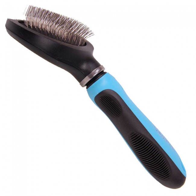 - krtača nežno in uspešno odstrani odpadajočo dlako in umazanijo, primerna je za krtačenje sprijete in zvozlane dlake ter vsakodnevno nego psov in mačk