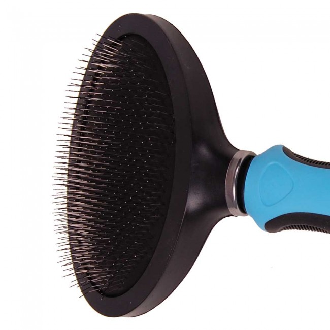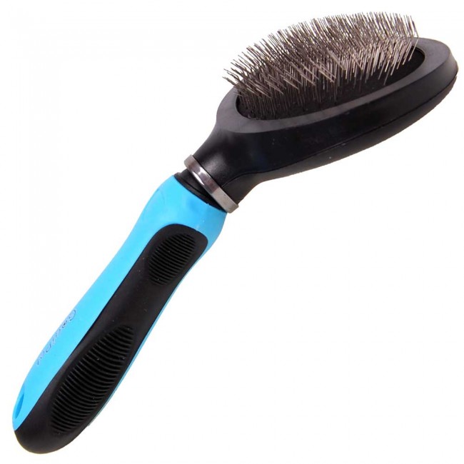 Ovalna, upogljiva GogiPet Slicker Brush krtača za pse velikosti ca. 19,5 cm x 11,5 cm x 3,7 cm je posebej oblikovana tako, da z njo uspešno odstranimo umazanijo in odpadajočo dlako, nežno razčešemo sprijeto in zvozlano dlako ter prezračimo kožuh psa do kože. Po uporabi GogiPet Premium Slicker Brush krtače L bo kožuh psa svežega in sijočega videza. Krtača je srednje trda, a njena upogljiva površina in iglice nameščene v mehko prožno podlogo zagotavljajo nežno, varno a učinkovito uporabo. Ročaj krtače je ergonomsko oblikovan in izdelan iz mehke gume, ki zagotavlja dober oprijem in preprosto čiščenje.