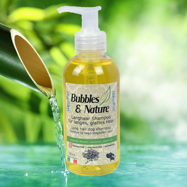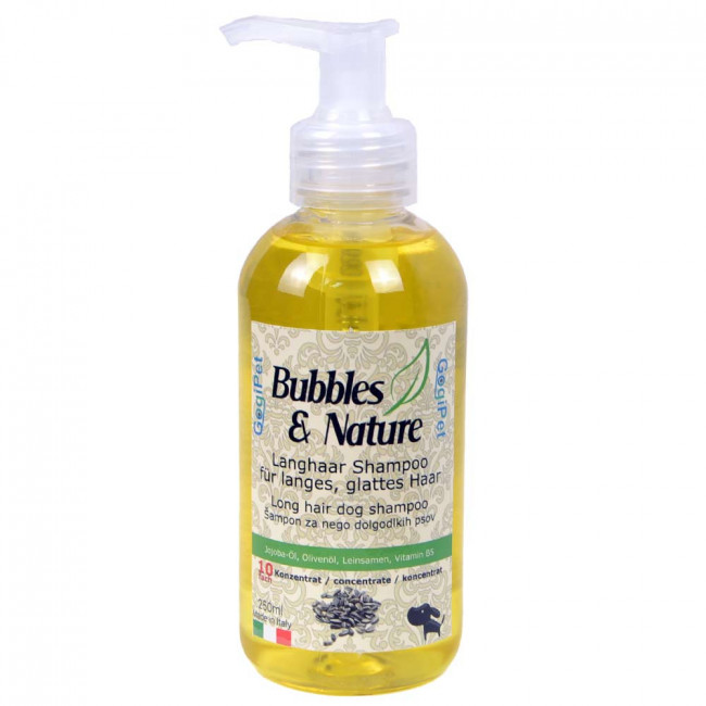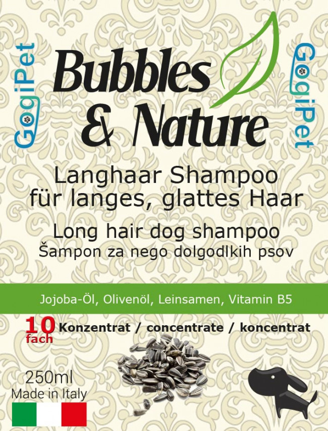 Šampon namenjen dolgodlakim psom. Njegove sestavine omogočajo lažje česanje dlake, prav tako pa preprečujejo vozlanje dlake in vračajo naravno prožnost dlaki in vlažnost koži. Vsebuje jojoba olje, lanena semena, vitamin B5 in olivno olje. JOJOBA OLJE blagodejno vpliva na poškodovano in suho kožo, vitamin E v njem pa pospešuje prekrvavitev, varuje ožilje, izboljša mišično aktivnost, uspešno odstranjuje manjše akne in ekceme na koži. Vsebuje sestavine podobne naravnemu kožnemu sebumu in se še posebej priporoča pri suhi koži, saj bo kožo navlažil. Čeprav vsebuje sebum ne škoduje mastni koži, temveč jo očisti in kontrolira nabiranje prekomernega sebuma. Z njim tudi preprečujemo izgubo vode. Zdravi razcepljene konice in ohrani zdravo ter močno dlako. Z redno uporabo prepreči prekomerno izpadanje dlake in srbečico. LANENA SEMENA vsebujejo omega-3 in omega-6 maščobne kisline, beljakovine , lecitin, vitamine B1, B2, B6, F in E, nikotinsko, folno in pantotensko kislino. Hrani dlako od korena do konic, ter varuje kožo pred zajedavci in alergijami. VITAMIN B5 vzpodbuja rast nove dlake, preprečuje sivenje in ohranja močno obarvanost. OLIVNO OLJE deluje varovalno na kožo, preprečuje številna obolenja kože, kožo naravno vlaži, daje prožnost dlaki in koži in deluje antioksidativno. Šampon je 10-kratni koncentrat, kar pomeni, da iz 250 ml šampona dobimo 2,5L šampona za kopanje.
