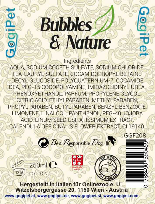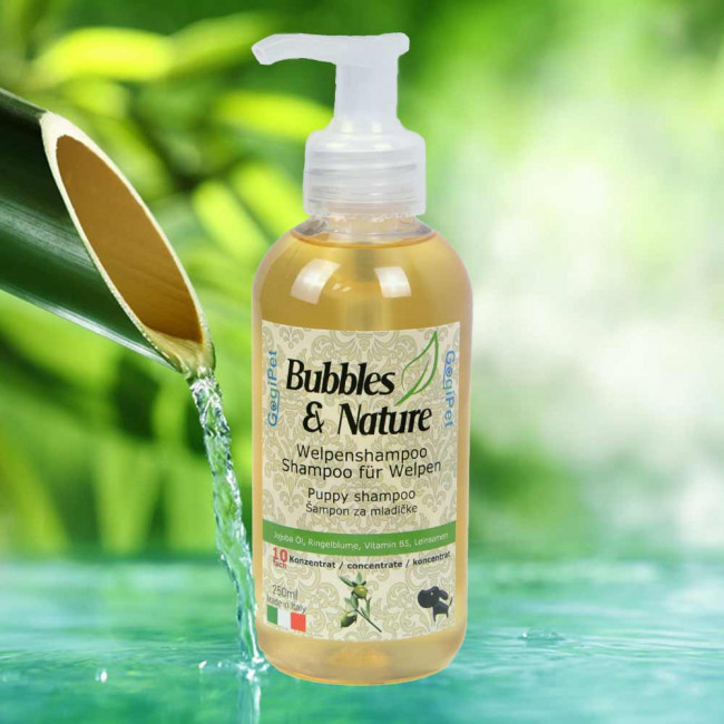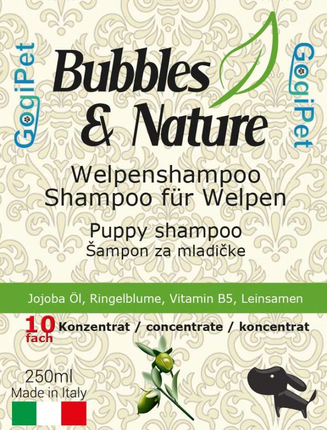 Šampon namenjen mladičkom od 2.tedna starosti. Njegove sestavine varujejo občutljivo kožo. Vsebuje jojoba olje, izvlečke lanenih semen in vitamin B. JOJOBA OLJE blagodejno vpliva na poškodovano in suho kožo, vitamin E v njem pa pospešuje prekrvavitev, varuje ožilje, izboljša mišično aktivnost, uspešno odstranjuje manjše akne in ekceme na koži. Vsebuje sestavine podobne naravnemu kožnemu sebumu in se še posebej priporoča pri suhi koži, saj bo kožo navlažil. Čeprav vsebuje sebum ne škoduje mastni koži, temveč jo očisti in kontrolira nabiranje prekomernega sebuma. Z njim tudi preprečujemo izgubo vode. Zdravi razcepljene konice in ohrani zdravo ter močno dlako. Z redno uporabo prepreči prekomerno izpadanje dlake in srbečico. LANENA SEMENA vsebujejo omega-3 in omega-6 maščobne kisline, beljakovine , lecitin, vitamine B1, B2, B6, F in E, nikotinsko, folno in pantotensko kislino. Hrani dlako od korena do konic, ter varuje kožo pred zajedavci in alergijami. VITAMIN B5 daje sijaj dlaki, vzpodbuja rast nove dlake, skrbi za močno obarvanost in preprečuje sivenje dlake. OGNJIČ deluje protimikrobno, pospeši nastanek novih, zdravih celic; saponini preprečujejo naselitev glivic na koži triterpenski alkoholi pa preprečujejo oz zmanjšajo vnetje. Šampon je 10-kratni koncentrat, kar pomeni, da iz 250 ml šampona dobimo 2,5L šampona za kopanje.