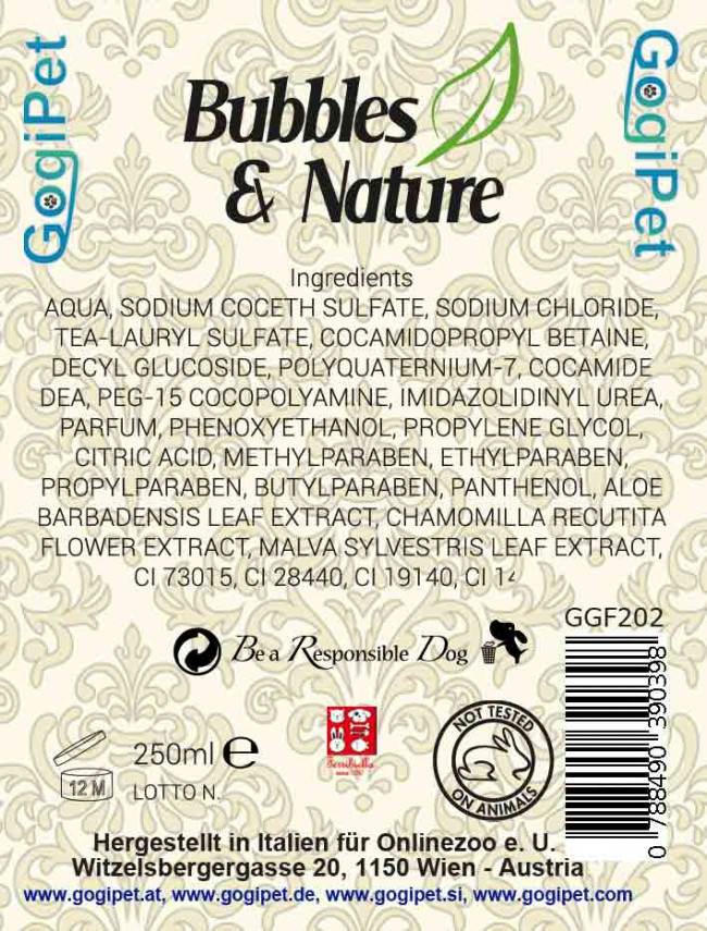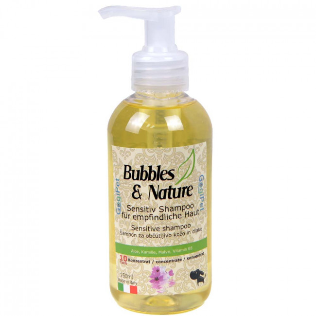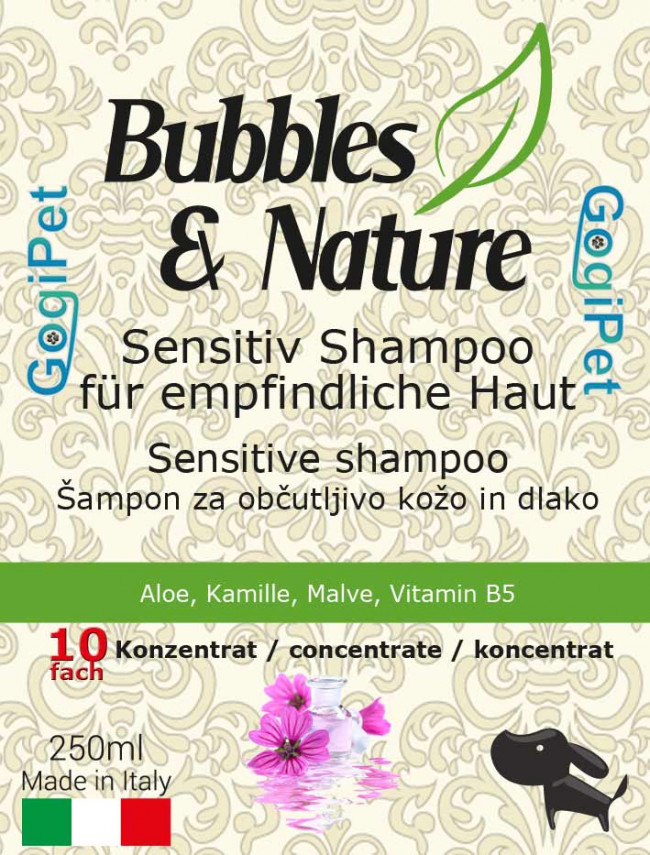 Šampon za pse z občutljivo kožo je namenjen negi zelo občutljive kože in dlake. Naravne sestavine kože ne dražijo, temveč jo pomirjajo, ji vračajo vlažnost in preprečujejo srbečico. Priljubljen je tudi pri vseh psih brez dlake in pri brezdlačnih pasmah ( kitajski goli pes, mehiški goli pes, mladički vseh vrst,..) Če je koža že poškodovana , vneta, izsušena pa se priporoča uporaba hipoalergenega šampona ali zdravilnega šampona z izvleči čajevca. Vsebuje izvleček aloe vere, kamilice, slezovca in vitamina B5. VITAMIN B5 vzpodbuja rast nove dlake, preprečuje sivenje in ohranja močno obarvanost. ALOE VERA blaži vnetja kože in pomaga pri njeni regeneraciji, deluje blago antibakterijsko, učinkovito vlaži kožo, pospešuje obnovo kožnih celic ter daje dlaki mehak in svilnat otip. SLEZOVEC uporabljamo pri preobčutljivosti kože in dlake in se ga uporablja pri vnetjih in obolenjih. KAMILICA preprečuje in zdravi lažja vnetja, razjede, odpravlja stres, pospešuje celjenje ran, odpravlja bakterije, glivice in viruse s kože in dlake (deluje antibakterijsko). Šampon je 10-kratni koncentrat, kar pomeni, da iz 250 ml šampona dobimo 2,5L šampona za kopanje.